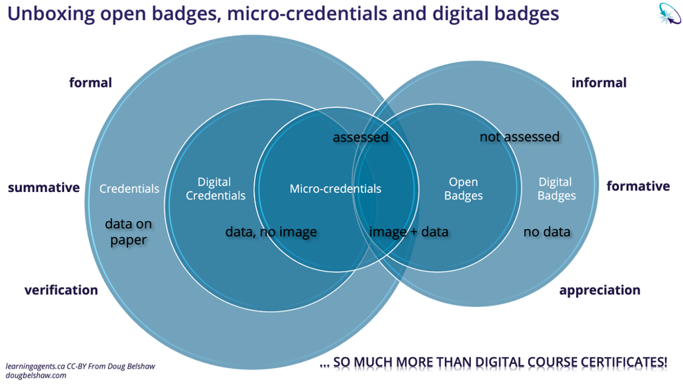 Spodnja slika, ki jo je po izvirniku Douga Belshawa povzel Don Present, dobro prikazuje izobraževalno pokrajino. Vse značke niso dokazila in vsa dokazila niso značke. Bistveno je, da značke, ki so usklajene s standardom Odprtih značk, vsebujejo metapodatke in imajo vse prednosti, navedene v prejšnjem razdelku.